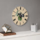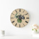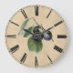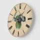 Vintage look wall clock has an illustration of a tree branch with trio of ripe plums and leaves on antique paper background