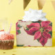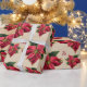 Wrap your holiday presents in this festive wrapping paper featuring a pattern of elegant Christmas red poinsettias outlined in gold with green leaves on an antique style background.