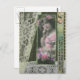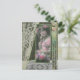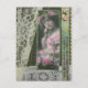 Photo of a fabric postcard, a vintage image of a girl, and “if I keep a green bough in my heart, then the singing bird will come†on the outside. Lace and buttons appear around the old fashion photo.