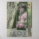 Photo of a fabric postcard, a vintage image of a girl, and “if I keep a green bough in my heart, then the singing bird will come†on the outside. Lace and buttons appear around the old fashion photo.