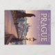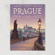 This postcard features a beautiful vintage-style illustration of Prague, Czech Republic, specifically showcasing the iconic Charles Bridge at sunset or dusk. The bridge's cobblestones and statues are illuminated by warm streetlights, with the city's charming skyline visible in the background under a soft, pastel-colored sky. The word "PRAGUE" is written vertically on the right side, framed by decorative swirls.