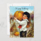 A public domain vintage art design taken from a vintage children's bible storybook. A cute young boy holding a giant pumpkin in a fall scene.