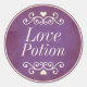 A vintage style love potion sticker. The text is written in cream on a dark purple background. Above and below the text there is a swirl flourish with a love heart.