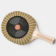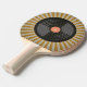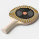 A ping pong paddle with a design of a vinyl record in the center, surrounded by alternating gold and white stripes with a polka dot pattern, set against a plain white background. The handle of the paddle is made of light-colored wood with subtle vertical grain patterns. The vinyl record design features a black disc with concentric grooves and a peach-colored center label. The overall style is graphic and retro, with a clean and minimalist aesthetic.