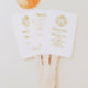 Regency-inspired wedding program fans with a gold baroque crest design adds timeless charm and delicate elegance to any ceremony. The front features a finely detailed rococo-style monogram emblem in gold, evoking the ornate sophistication of aristocratic European design. Classic script and serif typography beneath the crest present the couple’s names and ceremony order in a refined, easy-to-read layout. The reverse side continues the romantic aesthetic with coordinating fonts, listing the wedding party details and a heartfelt thank you note, or the text of your choice, in matching gold. Perfect for outdoor weddings or formal indoor affairs, this fan-style program blends vintage grace with practical function for a polished and memorable presentation.