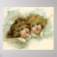 Vintage illustration Christmas holiday design featuring two Victorian angels with wings. These angelic girls are sitting on a cloud in heaven. Cute and adorable cherubs with curly hair.