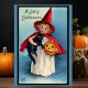 This early 1900's vintage Halloween card features a little girl in a white nightgown wearing a red witch's hat and cape holding a black cat and jack-o-lantern with a caption that wishes everyone "A Jolly Halloween". Personalize by changing the message inside the card and/or adding your name(s).