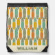 This pattern features simple illustrations of longboards with a vintage look in olive green, teal blue, sage green, mustard gold and orange set against a cream colored background. These longer style of skateboards have retro style in warm-toned colors. This bag is ready to be personalized with a name or other text along the lower edge.