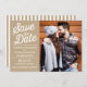 Photo save the date announcement featuring transparent banner with retro typography and a striped background.