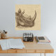 Stylish square poster with vintage brown tinted rhino head illustration on light tan "burlap" background. Wall mockup shows 24x24 square poster.