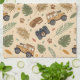 Rustic travel-inspired pattern kitchen towel featuring old-style cars, vintage road signs, leaves, and retro adventure elements in a charming countryside style. Ideal for road trip lovers, vintage enthusiasts, travelers, and anyone who loves nostalgic travel aesthetics.
