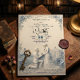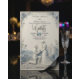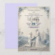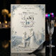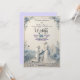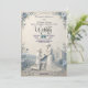 Announce your timeless love story with an elegant, traditional aesthetic featuring a beautiful dusty blue and cream palette for your formal celebration.This design showcases a classical romantic aesthetic centered on a beautifully illustrated proposing couple motif. The visual hierarchy draws the eye from the delicate floral corner borders—composed of roses, daisies, and botanical leaves—down to a man kneeling with a ring before a woman in an elegant gown. The backdrop depicts a classical chapel and cobblestone path set against rolling hills, all rendered in a cream and off-white base with dusty blue accents. The layout balances formal navy blue calligraphy script with clean modern sans-serif numbers and classic serif lettering.This is a flat printed image with a faux 3D bas-relief style and embossed effect, not actual raised material.