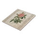 Retro ceramic tile featuring a vintage botanical illustration of a pink rose with antique French style embellished frame and old texture.