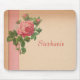 Antique, tea-stained paper has a spray of pink roses. A strip of pink ribbon adds accent to the side.