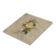 Richly-textured design featuring a spray of vintage roses in yellow and pink with delicate engraved floral ornament on a distressed vintage linen toned damask background.