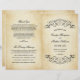 Decorative black swirls and flourishes frame this elegant vintage typography wedding ceremony sheet program design. The rustic ivory background is printed with a textured aged parchment paper appearance. Personalize the custom text for your bridal party, ceremony information, and thank you message. Note: these text weight paper programs arrive flat and require folding to assemble.
