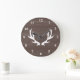 Vintage rustic hunting deer antler wood wall clock. Country chic home decor design with antlers. Brown Wood grain panel background texture. Stylish decoration for living or bedroom