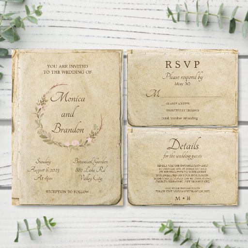 Vintage rustic old paper floral wedding invitation