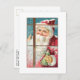 Festive and charming Victorian Christmas art featuring red-robed old world Santa at a window holding a doll with snow blowing around him. Background color is editable. Back features custom complementary graphics with editable text fields.