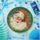 Paper plates with a retro image featuring a smiling happy Santa Claus surrounded by a pine wreath with a sprig of holly in his cap.