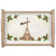 A vintage Santa and his sleigh full of toys flies past the Eiffel Tower in sepia from an antique French postcard from the Exposition in the 1800s, on a subtle background collage of vintage sheet music and framed by vintage sprigs of holly, to make this pretty French themed vintage Christmas serving tray.