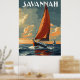 Embark on a journey through time with this charming vintage travel poster of Savannah, Georgia. This poster features a majestic sailboat gliding on tranquil waters, reminiscent of a bygone era.