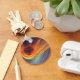 Vintage illustration futuristic outer space and planets Science Fiction image featuring a round rocket in space orbiting a planet and flying past the stars. It is glowing shades of red, yellow and orange colors, a reflection from the sun. A classic 50s retro comic book travel and transportation sci fi design.