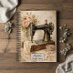 An antique sewing machine surrounded by soft roses, buttons, and vintage paper elements. Warm neutral tones and delicate floral details create a nostalgic sewing and craft themed composition.