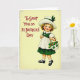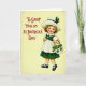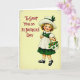 This greeting card shows a vintage-style scene with a young girl standing slightly off-center against a pale yellow background, giving the moment an easy, friendly feel 💚. She has curly blonde hair under a crisp white wide-brim hat, finished with an emerald green band and a small feather that tilts to one side. Her rosy cheeks, wide eyes, and small smile look like she’s about to greet a close friend, as if she’s sharing a quiet, happy secret. She wears an emerald green pinafore over a white puff-sleeve blouse, and she holds a little basket brimming with shamrocks and tiny red and yellow flowers ☘️. In the upper left, red cursive lettering reads “To Greet You on,” with “ST. PATRICK’S DAY” set just below it in red uppercase, leaving plenty of open space around the figure. The edges of the background look gently worn, like an old tin sign, which adds to the cozy, nostalgic look. Two small holes sit along the top edge of the design, as if it could be hung up on a wall.