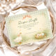 A charming storybook-style baby shower design featuring a sweet watercolor goose standing beside a nest filled with pastel eggs. Delicate spring flowers and soft greenery create a gentle countryside scene, while a blush bow and sage gingham background add a cozy cottagecore touch. The vintage illustration style and soft pastel palette give this design a whimsical nursery feel, perfect for a playful and heartwarming baby celebration.