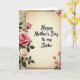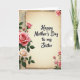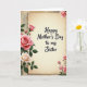 This greeting card features a creamy rectangular note in the center, with softly worn edges in a light sepia tone that feels like an old keepsake. Around it, blooming roses form a gentle frame, with a large rose-pink flower on the left and smaller buds tucked nearby, as if leaning in close like family sharing a quiet moment ❤️. In the lower right, a matching cluster of rose-pink blossoms and buds rises upward, balanced by deep green leaves that curl around the corners. Behind the central note, faint layers of textured paper add depth, like stacked letters saved over time. The main text sits centered on the note in dark lettering and reads “Happy Mother’s Day to my Sister,” standing out clearly against the warm background. Soft lighting warms the petals and paper, giving the whole scene a calm, affectionate glow 🌼. A pale cream bloom peeks from beneath the left rose, while the background shows muted, aged-paper textures in gentle tan and beige tones.