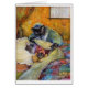 A vintage illustration of a bedtime scene where a mother cat in her nightgown and cap is tucking her little kitten into bed. The kitten has a teddy bear, and already looks fast asleep under her colorful patchwork quilt. This card is blank inside for your own message.