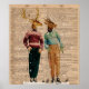 Vintage dictionary page print of two reindeer in vintage ski wear. Background is from an antique dictionary with added snowflakes. The reindeer illustrations are done in an antique vintage style.