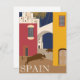 Vintage travel poster for the beautiful country of Spain or Espana in Spanish. It features a bull and iconic white buildings.