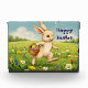 Celebrate Easter holiday with this charming super adorable Greeting Card featuring a joyful white bunny hops through a sun-drenched meadow bursting with wildflowers — daisies, tulips, bluebells, and dandelions — while carrying a woven basket filled with colorful, patterned Easter eggs.
