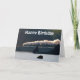 A birthday card for a train enthusiast. It has a vintage steam engine and passenger carriages, seen in the distance as she rounds the bend on the line that runs along the sea wall. The sunshine makes the steam from the engine bright white.