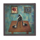 A unique and original piece of art created by Patricia Caldwell. The art design features a vintage look to a pair of black shiny stilettos on a table. The background is done in shades of blue, green and yellow brush strokes. On the wall hangs a painting of the same stiletto's and a picture of a red antique - vintage hat. Artwork was created digitally.