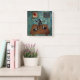 A unique and original piece of art created by Patricia Caldwell. The art design features a vintage look to a pair of black shiny stilettos on a table. The background is done in shades of blue, green and yellow brush strokes. On the wall hangs a painting of the same stiletto's and a picture of a red antique - vintage hat. Artwork was created digitally.