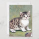 Card featuring a striped kitten. Black stripes run across a white kitten’s fur. A white flower decorates a basket in a grassy field. A fantastic gift for cat lovers and Victorian art enthusiasts!
