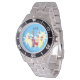 Has heft and feel of expensive stainless steel quartz watches. Good band with safety catch. I removed links, which is easy because engraved arrows show direction to push the linking pins. As always by this seller, the image (a railroad logo) is a perfect reproduction of my emailed image, and is precisely spaced and aligned.