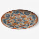 Decorative paper plate featuring an ornate design in yellow, red, rust, and blue. The pattern showcases intricate vintage-style scrollwork with flowing floral motifs radiating from a central rosette. Inspired by elegant European ceramics, this plate’s rich colors and detailed shading create the illusion of depth and real pottery, adding a sophisticated, handcrafted look—perfect for stylish parties and special occasions.
