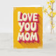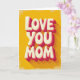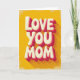 This greeting card features the words “LOVE YOU MOM” stacked vertically in the center, creating a tall, eye-catching layout that feels close and affectionate ❤️. Each letter is a creamy off‑white with small glossy highlights that make it look softly raised, like a sweet note meant to be held onto. A strong pink outline wraps every letter, adding depth and a friendly, romantic warmth to the message. Long, parallel shadows stretch to the side, giving the text a dramatic 3D look that suggests a sunny afternoon glow. The background is a rich golden yellow, and the contrast between yellow and pink makes the message feel lively and cozy at once 🌼. Subtle speckles and lightly worn edges sit across the backdrop, like a favorite keepsake that’s been looked at many times. The text stays centered and vertical, with off‑white letter faces and pink edging clearly separating it from the yellow field. Faint distress marks and tiny dots scatter near the corners and along the edges of the golden-yellow background.