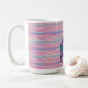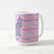 The front of this mug features a vintage pattern of shapes and lines processed and created digitally by me into a colorful, illustrated cat silhouette. The background is a vintage pattern of wavy stripes designed in complementary colors to give this one-of-a-kind mug an artsy style.