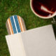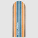 A colorful, retro stripe design in blue and orange on a faux wood print background. A vintage surfboard stripe design with a beach and surf look. Add your name or monogram to make this a personal paddle that will stand out amongst your friends. The name is a chunky sans serif font.