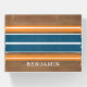 A colorful, retro stripe design in blue and orange on a faux wood print background. A vintage surfboard stripe design with a beach and surf look. Add your name or monogram to make this a personal phone case that will stand out amongst your friends. The name is a thin serif font.