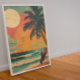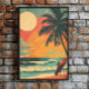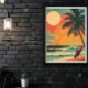 a surfer standing tall with his board, framed against a mesmerizing summer sunset. This poster captures the timeless allure of surfing culture, blending it with the nostalgia of retro aesthetics. It's like stepping back in time to the golden era of beach life. Hang it up and let it bring the spirit of adventure and freedom to any space, reminding you of endless summer days and the thrill of riding the waves.