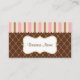 This business appointment card has a pink striped awning that adds retro style. Customize this business card to suit your needs. Add or delete information, change the font style, font size, etc...The design is from original art. Use this stylish business card for a spa, salon, small business, home decor, florist, ice cream shop, cake shop, gourmet chocolate, nail salon, inn, resort, cosmetologist, preschool, hair stylist, lawn care, event planner, child care, daycare, bed and breakfast, boutique, bakery, etc...
