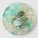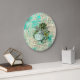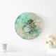 Pretty vintage collage features mint tinted teapot illustration with foliage and green butterfly on pastel aqua distressed ephemera background and white clock face