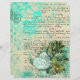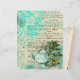 Pretty vintage collage features mint tinted teapot illustration with foliage and green butterfly on pastel aqua distressed ephemera background