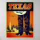 This is a classic Americana poster, a vintage travel ad for Texas with a cowboy wearing cowboy boots and a hat looking at the big city.